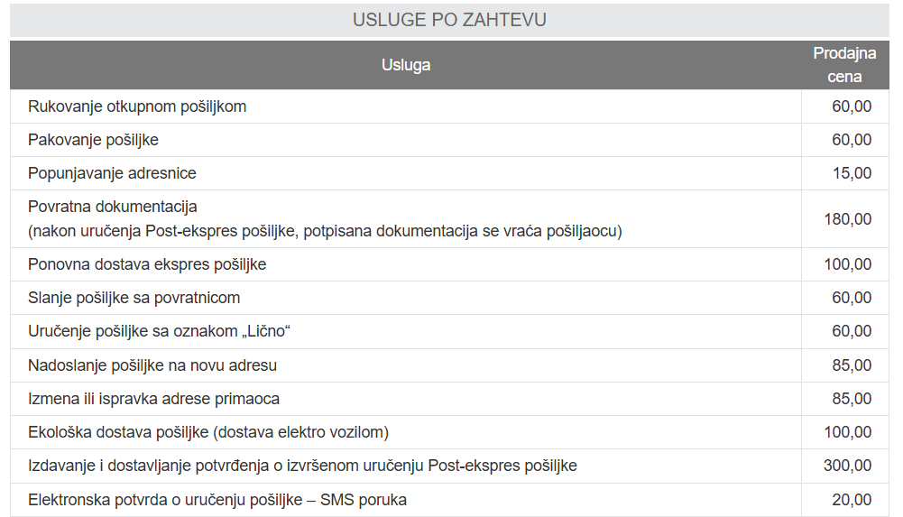 Prema novom cenovniku uvedene su nove cene i usluge koje će se naplaćivati po zahtevu. Najskuplje pošiljke su danas za odmah i njihova cena je porasla za 200 do 300 dinara.