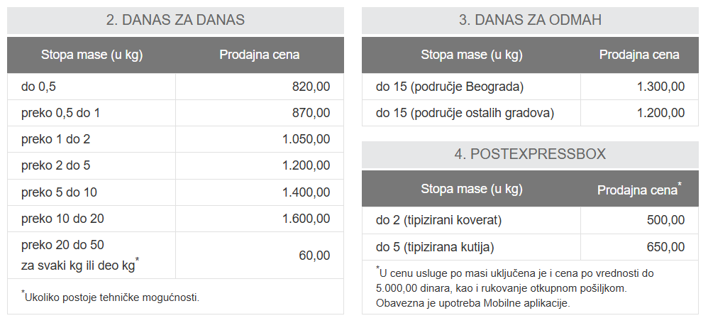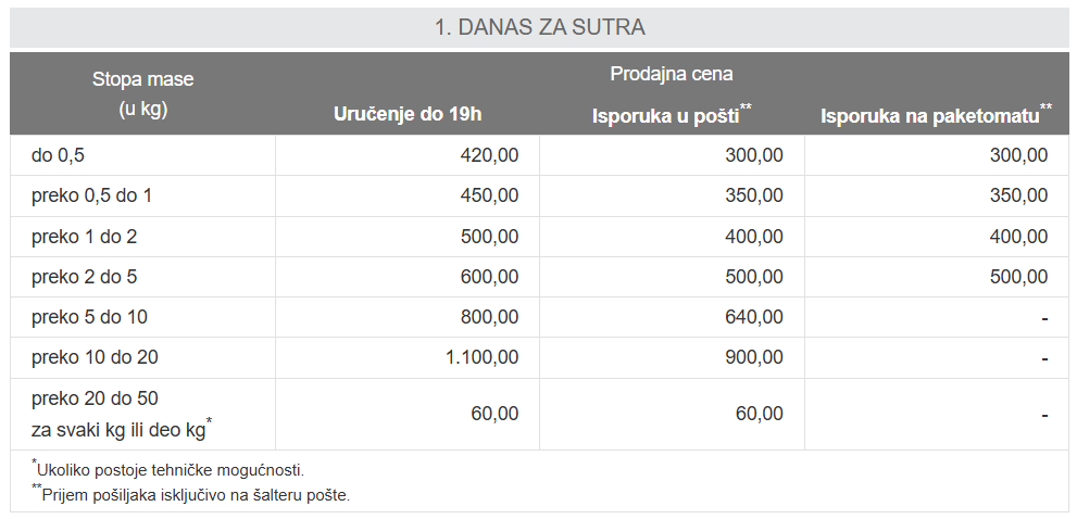 Isporuka pošiljki Post Expressom danas za sutra je poskupela i takođe je podeljena po kategorijama u zavisnosti od težine paketa.